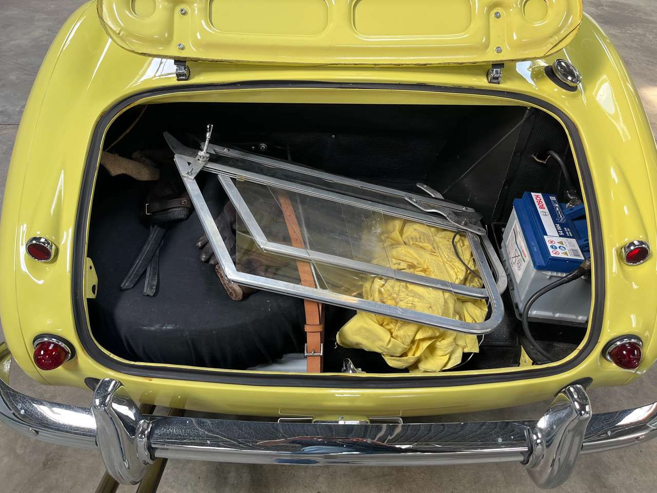 Very nice Austin Healey 3000 MK1 BT7 with overdrive in Pimrose Yellow for sale from private collection. The last owner bought the car in 2000 and the car was completely restored in 2005 (the complete foto report is available). The car is in original condition and has been well maintained over the years. The engine was completely overhauled at the time and this 6 in line runs very nicely, an electronic ignition was installed. The car has 4 gears (side shift) with overdrive. The car has renewed chrome spoke rims with 60 spokes, the chrome work and the trim parts were renewed. The exhaust was renewed with a RVS one, the car is equipped with disc brakes at the front and drums at the rear. The suspension was restored according to original specifications. The interior was renewed during the restoration and is in good condition, only the yellow piping of the seats disintegrates. Austin Healeys are always popular classics because of their fantastic driving quality and road holding. There is an easy way to get parts for these cars. The car is equipped with a tonneau cover and side windows. The car has a Heritage Certificate (matching numbers), and is provided with a valuation report from 06-2025.